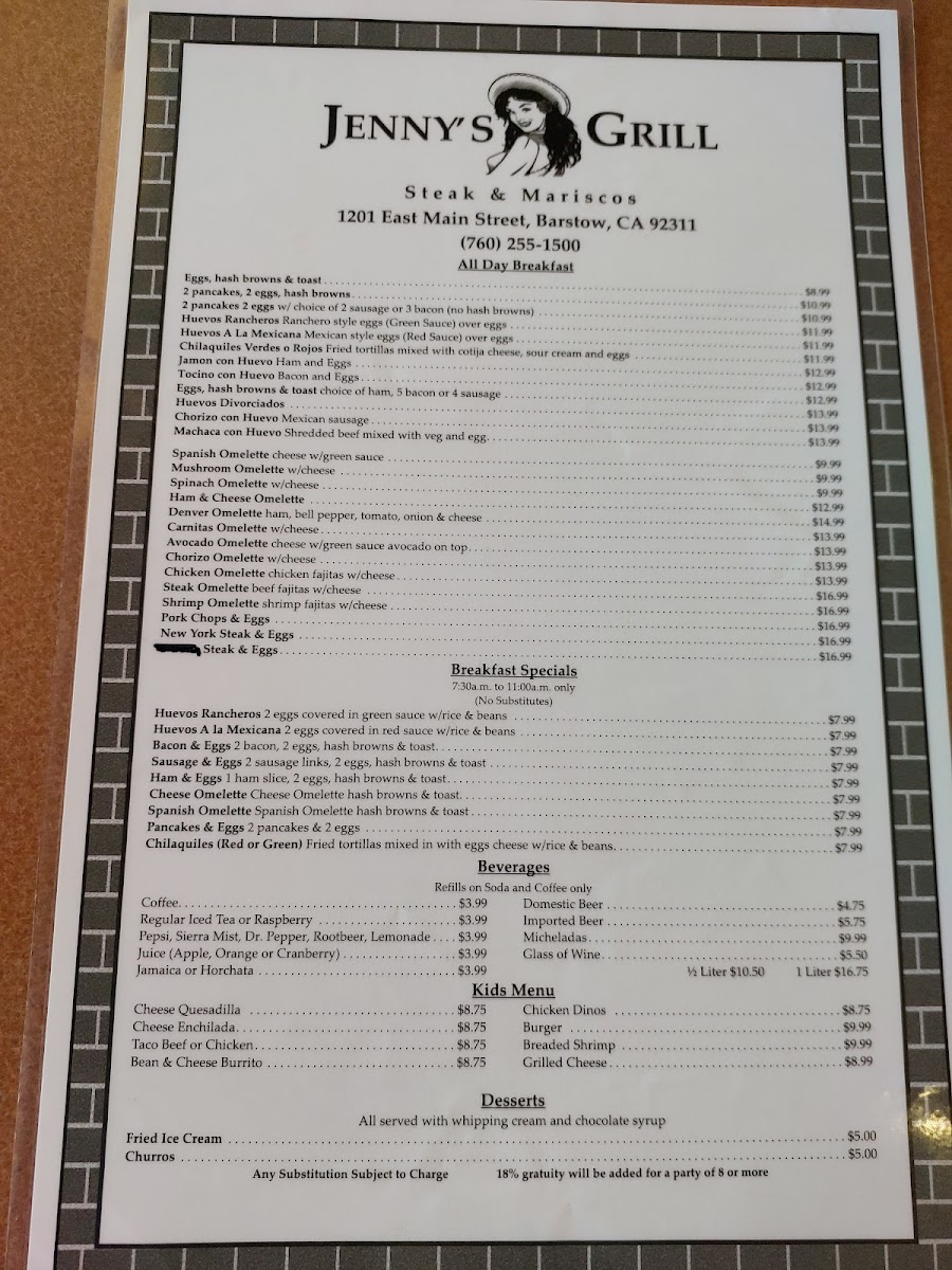 Welcome to Jenny's Grill Steak & Mariscos, a culinary gem located at 1201 E Main St, Barstow, CA. This family-run establishment beautifully marries American and Mexican cuisines, making it a must-visit for both locals and travelers alike. With fast service and an extensive menu, diners indulge in dishes like flavorful shredded beef enchiladas topped with rich red sauce, savory Carne Asada nachos, and a delicious array of sides including perfectly seasoned rice and beans.